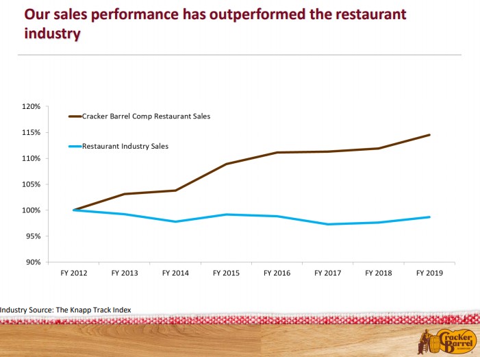 Image Source: 2019 Annual Shareholder Meeting, November 21. Although the restaurant business continues to face pressures, Cracker Barrel’s fundamentals have outperformed.
