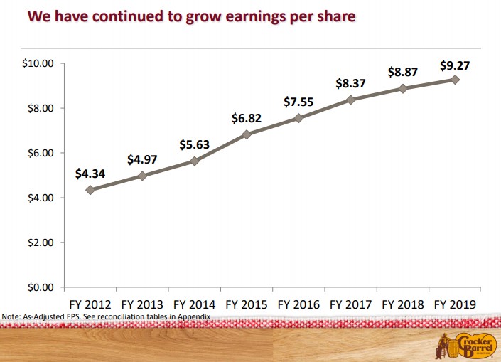 Image Source: 2019 Annual Shareholder Meeting, November 21. Cracker Barrel’s earnings per share performance has been strong during this cyclical upswing. Adjusted earnings per share is expected to advance in fiscal 2020, too.