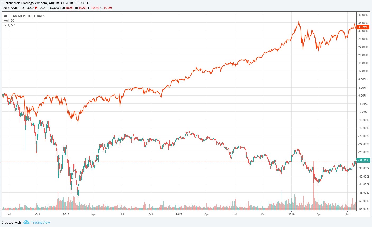 Image Shown: Since mid-June 2015, the performance of an ETF tracking the midstream MLP industry (AMLP) has collapsed while the performance of an ETF tracking the S&P 500 (SPY) industry has surged.