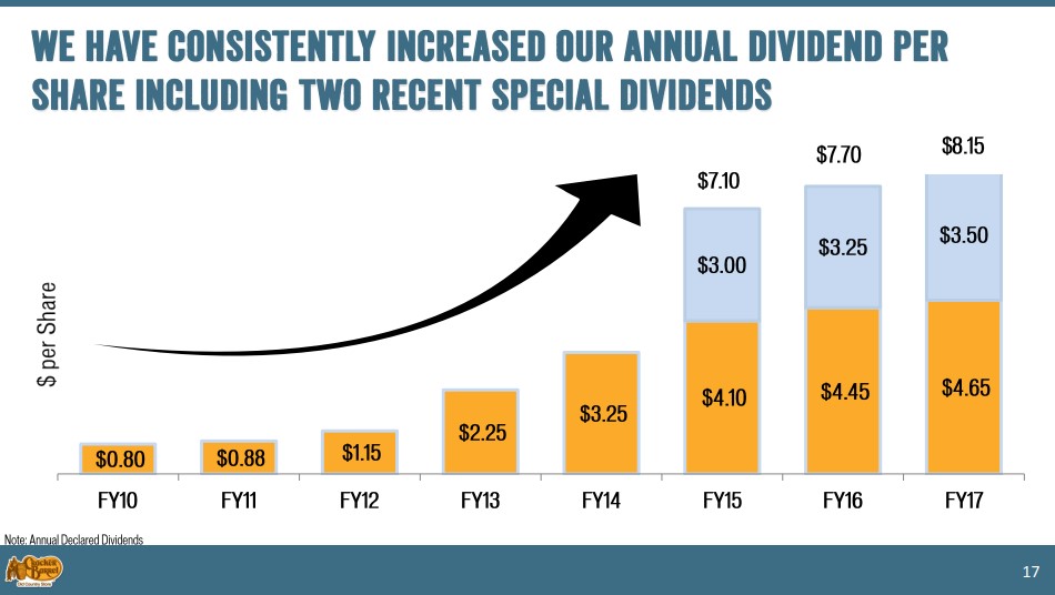 All in, we continue to believe Cracker Barrel is a good fit for the Dividend Growth Newsletter portfolio, in part because special dividends are doing a good job hiding its income potential, thereby translating into an above-average dividend yield (in most years). Including the $3.50 per share special dividend, total dividends declared in fiscal 2017 amounted to $8.15 per share (it also issued special dividends of $3 and $3.25 per share in fiscal 2015 and fiscal 2016, respectively; see page 17 here). On the basis of 2017 numbers, that’s nearly a 5.4% dividend yield given Cracker Barrel’s share price at the time of publishing. We’ll be watching for any impacts from Hurricane Harvey and Hurricane Irma, though we believe any dislocations will be transitory.