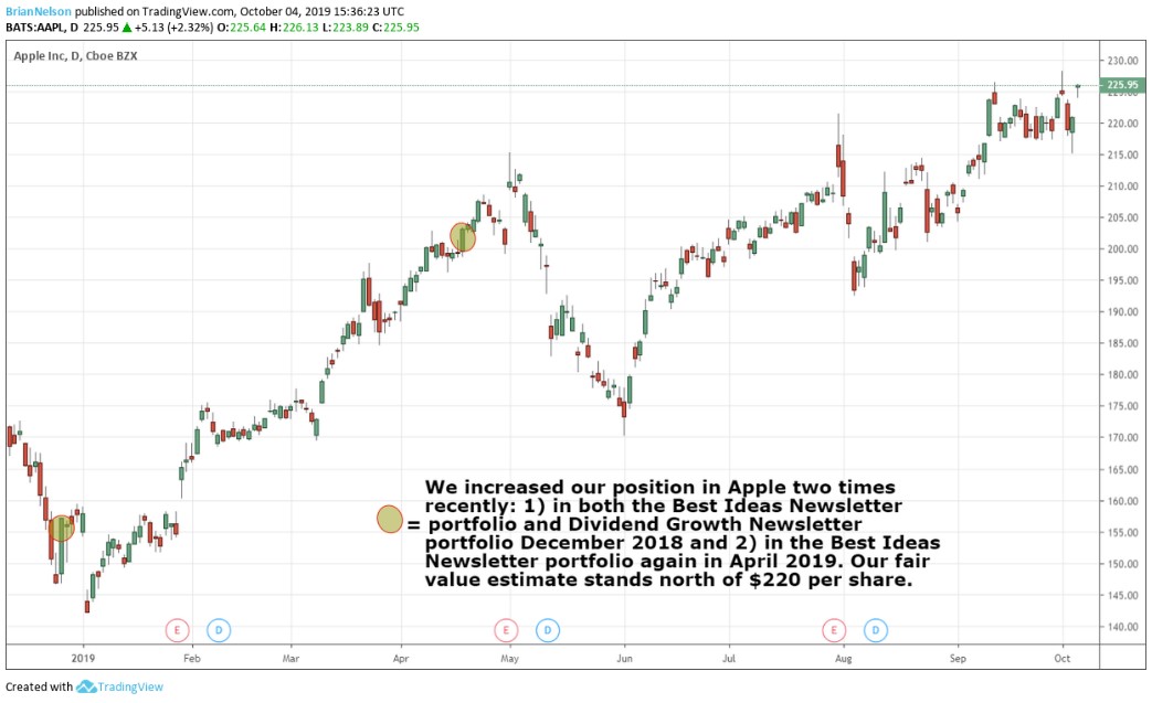 Image: We increased the weighting in Apple two times recently: 1) in both the Best Ideas Newsletter portfolio and Dividend Growth Newsletter portfolio December 2018 and 2) in the Best Ideas Newsletter again in April 2019. Our fair value estimate for Apple stands north of $220.