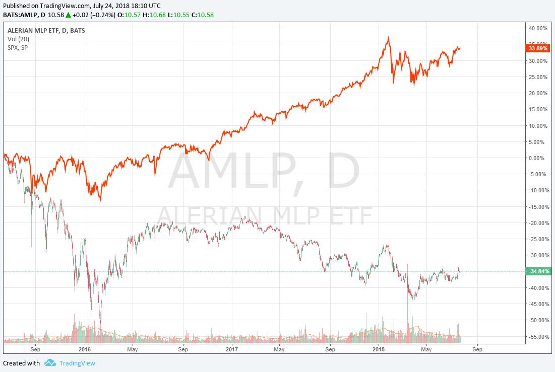 Image shown: The prices of MLPs have collapsed since mid-June 2015 as the stock market has surged.