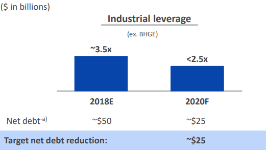 The remaining company will also be focused on debt repayment, with a goal of paying down ~$25 billion in Industrial net debt (excluding Baker Hughes) by 2020 to go along with a net debt-to-EBITDA target of less than 2.5x as it continues to shrink the GE Capital balance sheet. This $25 billion target includes a transfer of $18 billion in healthcare debt and pension deficit to the to-be-formed healthcare company, and management plans to monetize ~20% of GE Healthcare, which will help it realize its ~$9 billion debt and commercial paper reduction target.