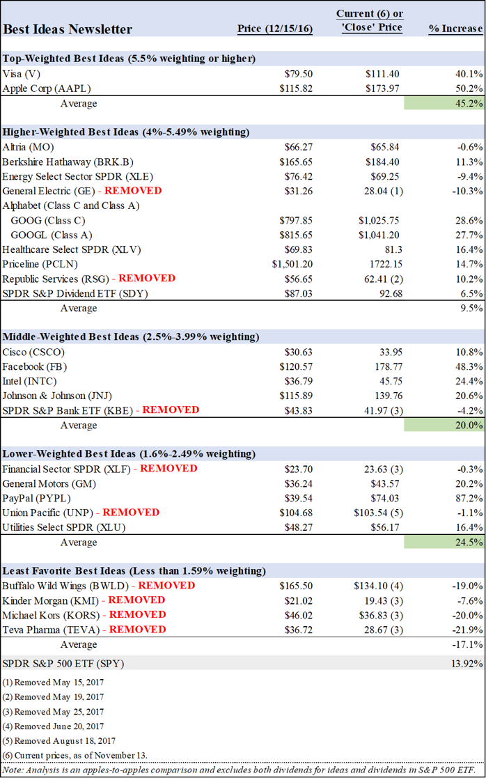 1) “The top-weighted ideas in the Best Ideas Newsletter portfolio, Apple and Visa, performed wonderfully from the release of the December 2016 newsletter through November 13, 2017, averaging more than an increase of 45%, excluding dividends, versus a mid-teens percentage advance for the S&P 500, excluding dividends.”