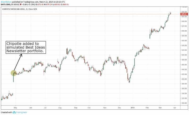Image shown: Chipotle (CMG) has been one of our best calls so far in 2019.