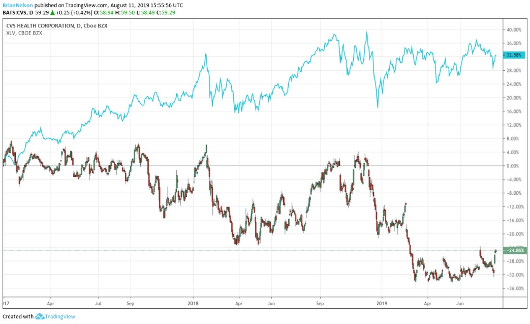 Image shown: CVS Health has significantly underperformed the Healthcare Select Sector SPDR ETF (XLV) since the beginning of 2017.