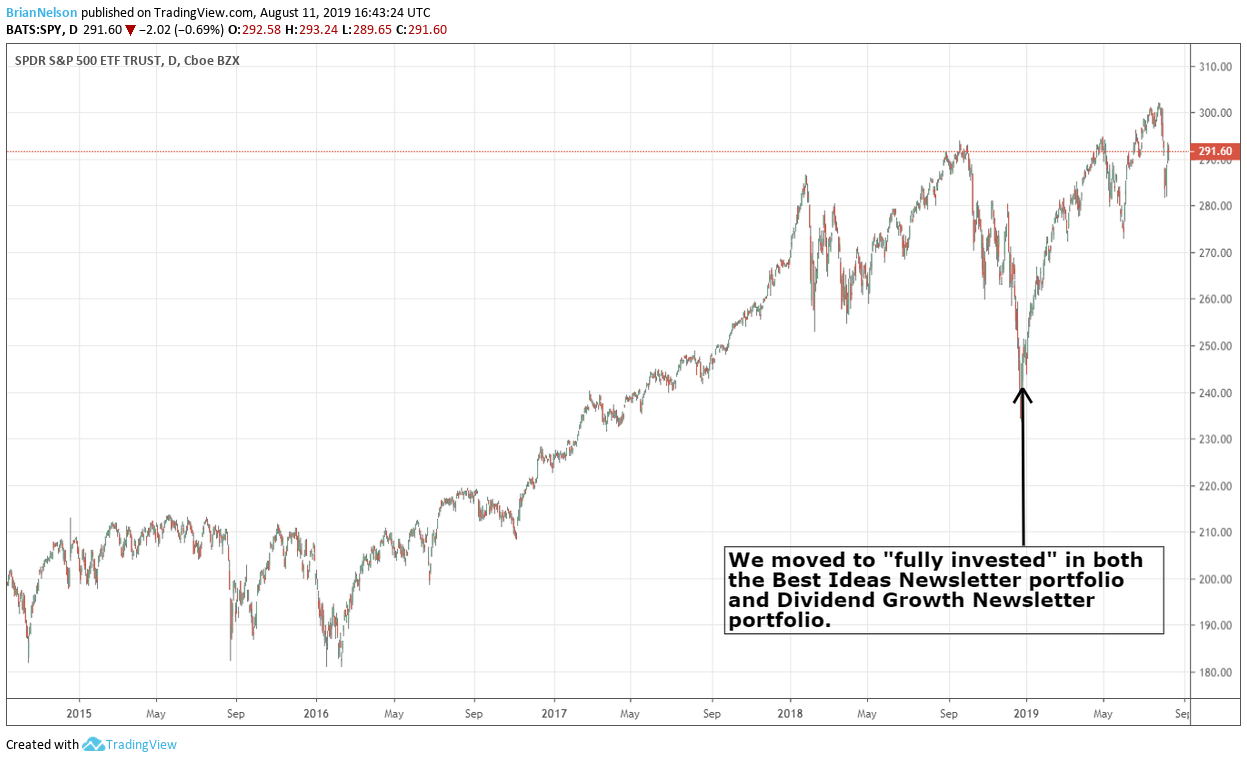 Image Shown: In our December 26 note to members, we moved the simulated Best Ideas Newsletter and simulated Dividend Growth Newsletter portfolio to “fully invested” from a cash “allocation” of 30% and 20%, respectively at the high end of the range. It has worked out wonderfully as we keep our finger on the put option trigger in case price-agnostic trading and heightened volatility rears its ugly ahead again, as it did in December 2018.