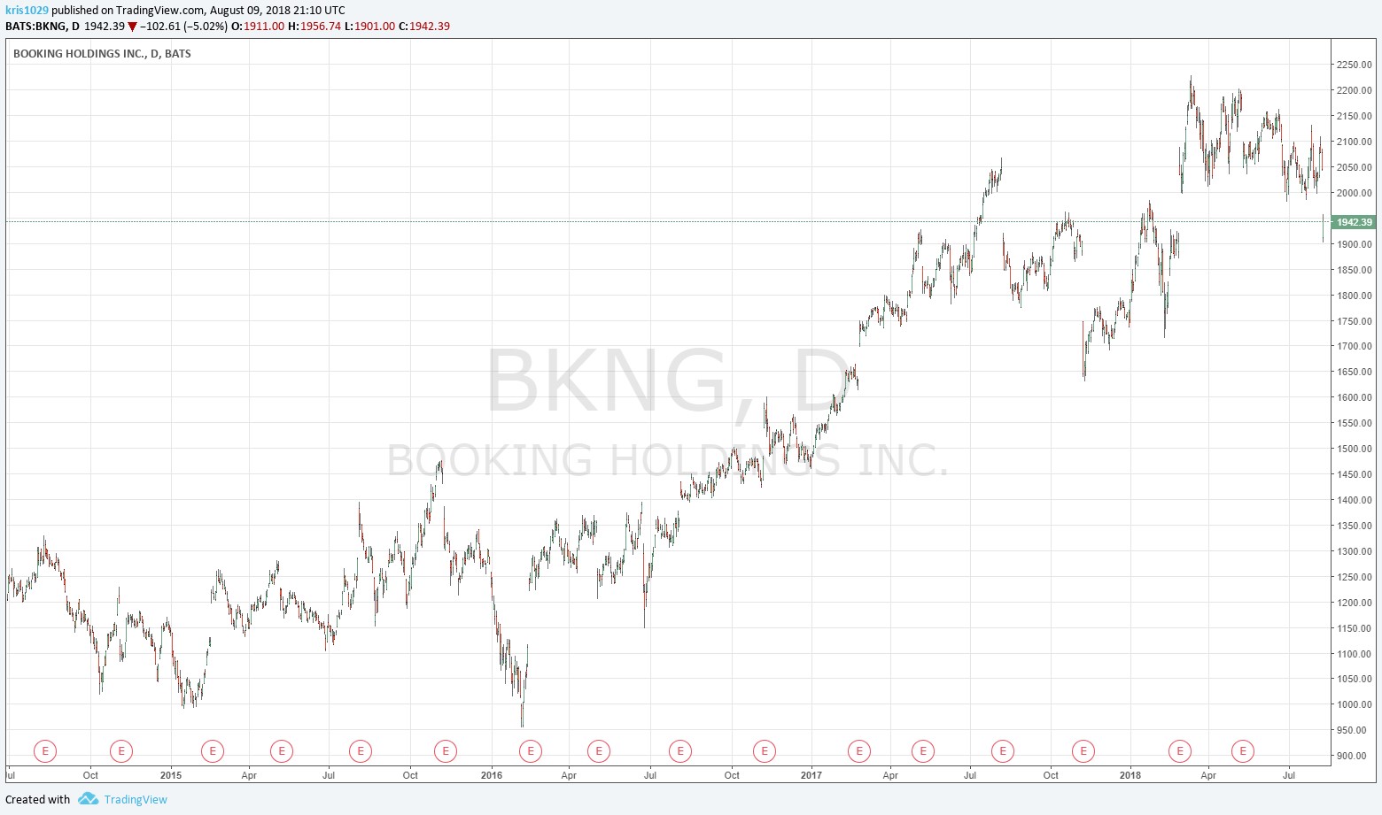 Image shown: Booking Holdings share price performance in recent years. Note the magnitude of share price volatility around quarterly earnings reports.