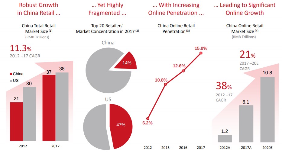 Though total retail market growth in China may slow in coming years, JD.com continues to expect robust online annual growth of ~21% through 2020, to 10.8 trillion RMB. We don’t expect concerns about trade tariffs between the US and China to damage this strong backdrop for JD.com either. The total Chinese retail market is only slightly smaller than that of the US (roughly 37 trillion RMB in China compared to 38 trillion RMB in the US), and it is far more highly fragmented than that of the US retail market as the top 20 participants account for only ~14% of the total market compared to ~47% in the US as of 2017.
