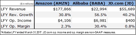 JD.com plans to set up shop in Los Angeles before the end of 2018 that will eventually allow it to provide same-day delivery, a feature already well-established by Amazon in many markets. US retail giant Walmart (WMT) is likely to play a role in enhancing JD.com’s initial efforts in the US as Walmart holds a ~12% stake in JD.com and both have a mutual competitor in Amazon. JD.com’s strategy in the US is simple: to sell quality Chinese goods at prices lower than established competitors. Amazon’s entrenchment is a tremendous obstacle, and the network effect that has benefited JD.com in China has been in full swing for Amazon from some time now. Taking on Amazon is a massive challenge in itself, but JD.com’s haste in establishing a presence in the US is also likely aimed at beating Chinese competitor Alibaba, the only Chinese e-commerce firm larger than JD.com itself. Local partnerships such as its partnership with Walmart will be key for JD.com to establish itself and gain consumer trust in the US.