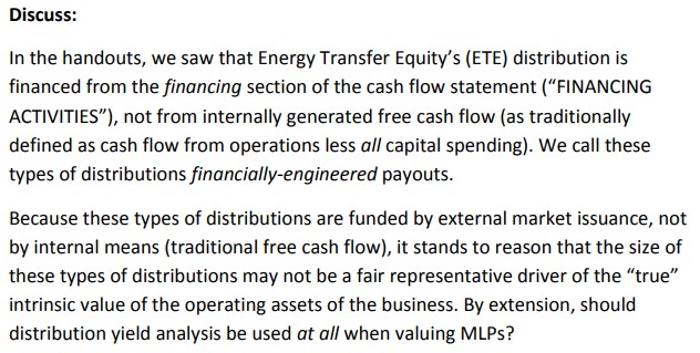 The bottom line: If traditional free cash flow should not be viewed as a measure representing “the residual cash flow available for discretionary expenditures,” including dividend policy (which is discretionary), some may reason that distributable cash flow should probably not be used either to set MLP distribution policy, itself discretionary to a large degree. It is our view that only when debt and equity funding becomes more prohibitive in the face of rising interest rates or tumbling energy resource prices will we see (again) just how much MLPs depend on the healthy functioning of the capital markets to fund their distributions–and how little “distributable cash flow” reflects the underlying “value” of the MLP business model.