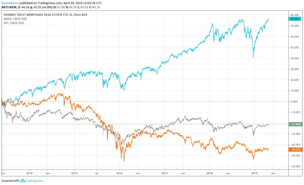 Image: Since late May 2013, mortgage REITs, as measured by the iShares Trust Mortgage Real Estate ETF (REM), middle, have fallen more than 20%, while the master limited partnership space, as measured by the Alerian MLP ETF (AMLP), has fallen by nearly 45%, bottom. Meanwhile, the S&P 500 (SPY) has rallied more than 75%, all on a price-basis, top.