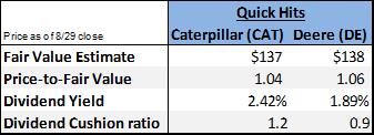We continue to like Caterpillar and Deere as strong companies, even with concerns that a demand peak has cropped up more recently. While we’re not sold on an organic demand peak being a near-term hindrance for the construction or agriculture markets, uncertainty related to geopolitical issues and trade policies are not to be taken lightly, even as we applaud companies like Caterpillar and Deere in hurdling the obstacles presented by politicians and legislators around the globe. Shares of Cat yield ~2.4%, while shares of Deere yield ~1.9%.