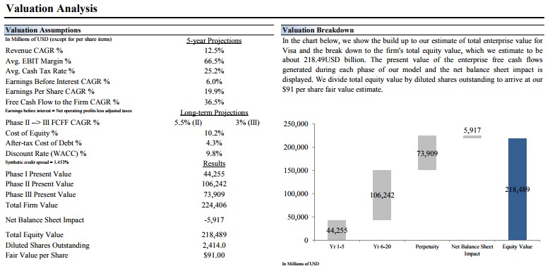 I like to look at valuation in the context of a discounted cash-flow framework, coupled with a fair value estimate range. I think this just makes sense. The value of a company is in part a function of what it has plus what it will generate in the future. Visa has a net debt position currently, but its future free cash flow generation potential continues to be phenomenal. We assume revenue will grow at a low-double-digit clip during the next five years (includes fiscal 2017) as operating margins average in the mid-to-high 60% range. This should drive a very nice ramp in earnings and enterprise free cash flow, in our view, as the magnitude of cash-flow-from-operations generation trumps any comparatively modest increases in necessary capital outlays. Though we estimate Visa’s shares are worth ~$90 today, meaning the market may be getting ahead of it a bit, strong free cash flow generation offers Visa the potential to grow into its current share price. The high end of our fair value estimate range is ~$109.