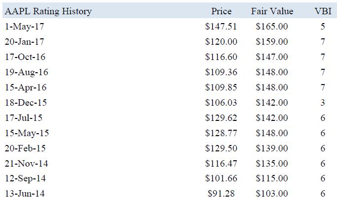 The market has seemingly always had Apple’s (AAPL) shares mispriced. Our fair value estimate of the iPhone giant has been above its trading price for years, and we’ve included the company in both newsletter portfolios since inception. It’s been a win-win for Valuentum investors and dividend growth investors alike. A look at Apple’s rating history (newest to oldest) showcases just how much conviction we’ve had in the idea, and shares have now almost converged to our present $165 per share fair value estimate. Berkshire Hathaway (BRK.A, BRK.B) doubled its stake during the first quarter of 2017, and we’re witnessing some pretty impressive price targets from the sell side. BofA Merrill Lynch recently upped its target to $180, and some are even saying shares of Apple could catapult to $200, even higher than the upper bound of our fair value range. We like Apple–it deserves more attention.