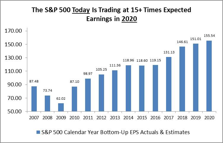 Here’s why: On March 31, the S&P 500 was trading at a forward price-to-earnings ratio of 17.6 times, above its 5-year average of 15 times and its 10-year average of 14.3 times. That’s not all that’s troubling though–the S&P 500 is trading at 16.1 times calendar 2018 earnings of $146.61, which implies growth of nearly 12% on top of double-digit growth expected in calendar 2017. If we apply a 3% bottom-line growth rate in earnings for 2019 and 2020, the S&P 500 today is trading at ~15 times 2020 earnings. Translation–the market is pulling forward years and years of growth in current prices.