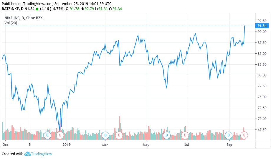Image Shown: Shares of Nike popped on September 25 after reporting a strong first quarter for fiscal 2020 and issuing favorable guidance for the full fiscal year.