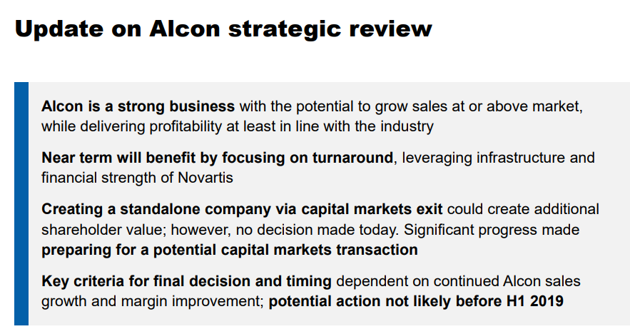 Though Novartis emphasized that a final decision has not been reached regarding the ultimate fate of Alcon, it has laid out a credible path towards a split-off of the Alcon division with the first half of 2019 being the earliest time frame such a transaction may take place. We support the potential move as the Alcon division does not hold the strategic purpose it once did. The continued growth of Regeneron’s (REGN) retina disease treatment Eylea coupled with a generic launch of Roche Holding’s (RHHBY) Avastin has taken the wind out of Lucentis’ sails, thus leaving Novartis with fewer reasons for holding on to the ophthalmology division.