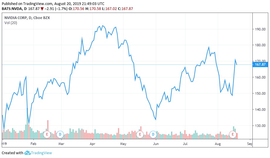 Nvidia Corporation (NVDA), like the rest of the semiconductor industry, has been on a wild ride over the past few years. On the one hand, the industry has benefited from the cloud-computing build out and the rise of smartphones, along with the emergence of autonomous driving, the internet of things (“IoT”), machine learning, and artificial intelligence. On the other hand, semiconductors are now contending with headwinds from the bust in the cryptocurrency craze, the sharp slowdown in data center investments due in part to ongoing trade wars, and other factors like excess inventory. Expectations were very low for Nvidia heading into its second quarter FY2020 earnings, released August 15, which is largely why shares moved up significantly after the report indicated things weren’t as bad as feared. Shares of NVDA yield 0.4% as of this writing.