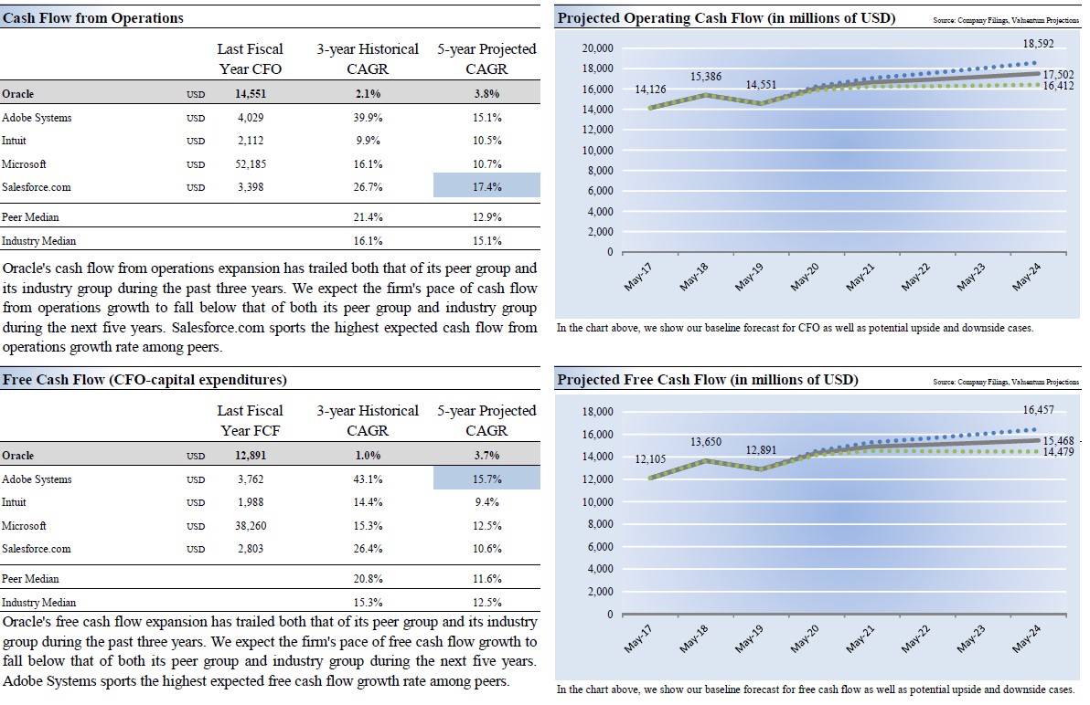 Image Shown: Oracle’s net operating cash flows are very stable, and we see those cash flows steadily growing over the next five years. That trajectory is aided by the firm’s aggressive push into the cloud computing space both domestically and overseas.