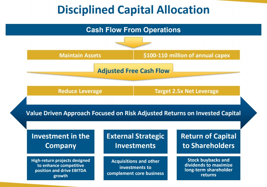 Making matters worse is that the company now has an adjusted net debt position of $1.16 billion (up from $1.08 billion at the end of 2018) and just $250 million of liquidity (~$180 million on its revolver). Needlessly, the firm shelled out $14 million in the first quarter on dividends and buybacks. Net debt stood at 3.9x EBITDA at the end of the first period, well above its 2.5x target.