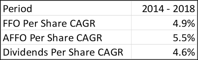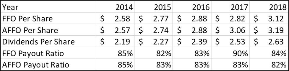 Image Shown: A look at Realty Income’s financial performance from 2014 to 2018. Note the modest improvement in its payout ratios and consistent AFFO per share growth. Image Source: The table was created by the author using data from Realty Income’s IR website
