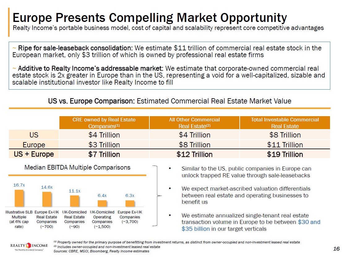 Going forward, Realty Income is very optimistic on Europe’s commercial property market as it represents an $11 trillion opportunity in total investable commercial real estate. Only $3 trillion of that is thought to be owned by “professional real estate firms,” indicating Realty Income thinks there could be a lot of European demand for sale-leaseback and other transactions, demand that isn’t being properly catered to. We caution that entering new markets overseas represents Realty Income stepping outside of its core competencies and that there will be a learning curve when it comes to dealing with a different set of rules, regulations, taxes, currencies, and other considerations.