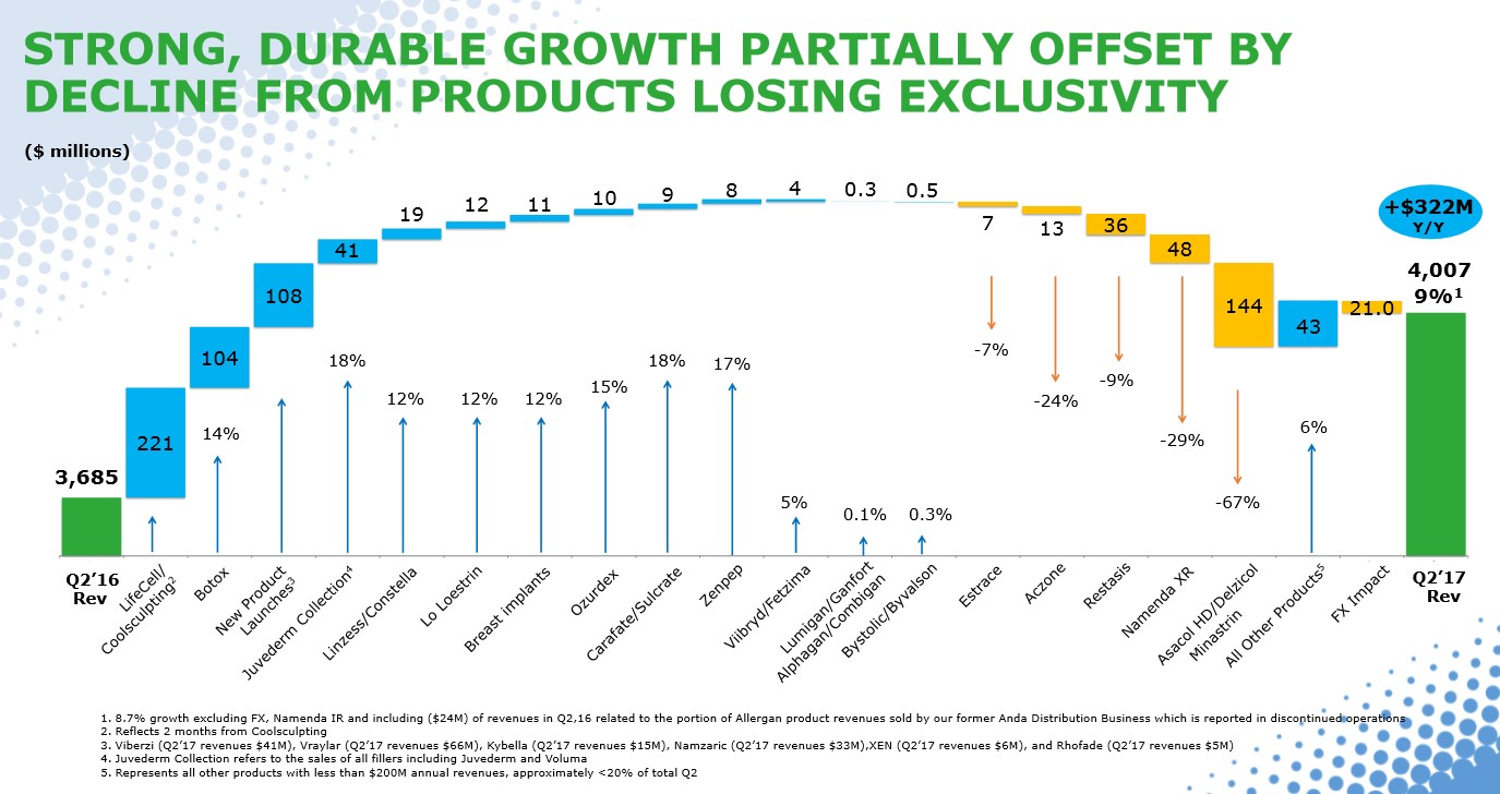 Allergan has a bloated balance sheet with $30.2 billion in total debt–compared to just over $5.8 billion in cash, cash equivalents, and marketable securities–and nearly $49.6 billion in goodwill, the side effects of years of dealmaking. The company’s net debt-to-adjusted EBITDA came in at 3.2x as of the second quarter of 2017. To management’s credit, it has largely refrained from major deals, but Allergan will likely continue to be a “work in progress” as it builds out its product line-up via additional tuck-in acquisitions over the medium term.