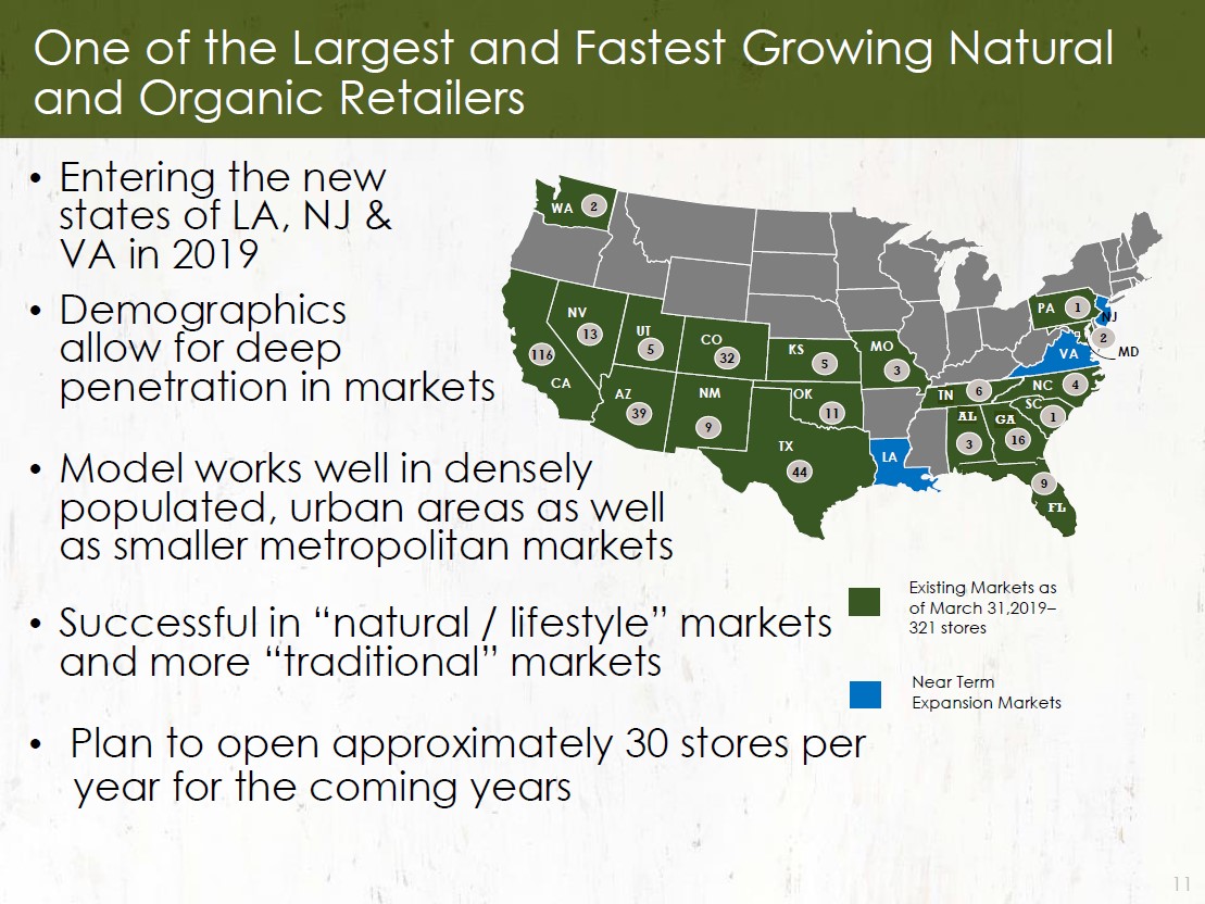 Sprouts opened stores in Louisiana and New Jersey for the first time during the second quarter, and now has a presence in 21 US states. The organic grocer plans to expand into Virginia this year as well. There’s room to grow further but note that the US grocery market (even for organic food sales) is already full of supermarkets. Sprouts’ growth trajectory will need to contend with existing competitors and the possibility for serious e-commerce disruption (which we are already beginning to see). For now, Sprouts is targeting 30 new store openings per year over the coming years.