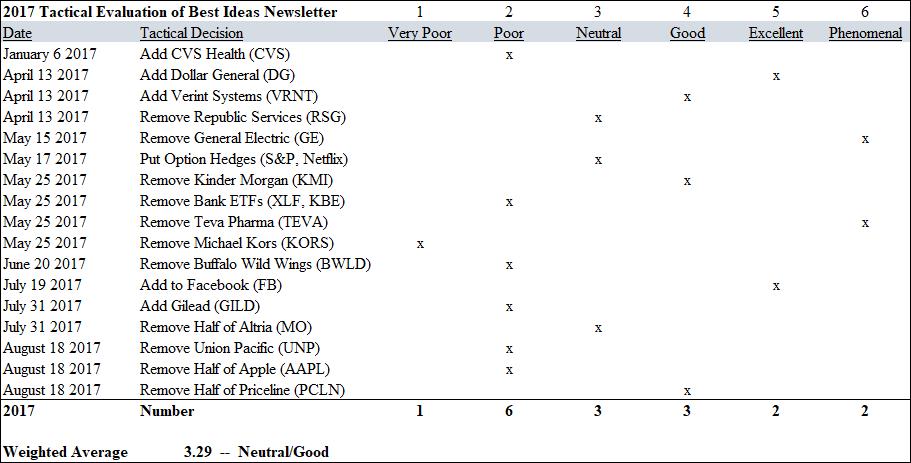 July 2017 was a great month in that we tactically decided to add another three percentage points of exposure in the Best Ideas Newsletter portfolio to the position in Facebook (FB) in the mid-$160s; shares are now trading over $180 at the time of this writing. We also added Gilead (GILD) in late July at $76.32, and shares are off just a bit trading at ~$72 each at the time of this writing. The decision to remove half of the position in Altria (MO) proved to effectively be a wash, given that the company’s equity is essentially at the same level since the end of July. The August ideas to remove Union Pacific (UNP), half of Apple (AAPL) and half of Priceline (PCLN) were mixed, with the first two coming up tactically short, but the last one a tactical win.