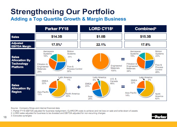 On an adjusted basis (“adjusted for business to be divested and EBITDA adjusted for non-recurring charges”), Parker-Hannifin notes that LORD Corporation generated $1.0 billion in annual sales with an adjusted EBITDA margin of 22.1% in FY2018 (in terms of the portion of the business Parker-Hannifin doesn’t plan on getting rid of). Note that in FY2018, Parker-Hannifin generated $14.3 billion in sales with an adjusted EBITDA margin of 17.5%, so this acquisition (in theory, we will be monitoring the integration process) could offer profitability upside before taking expected synergies into account.
