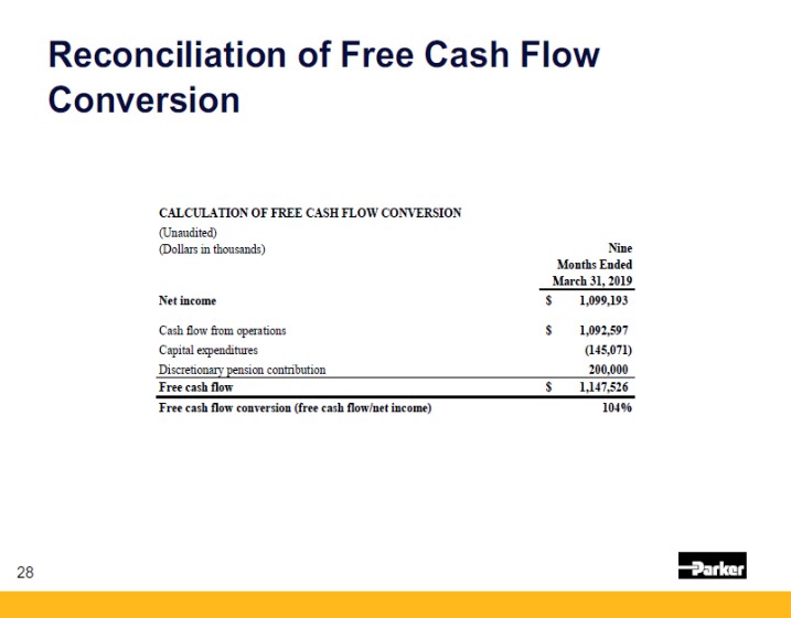 At the end of March 31, 2019 (Parker-Hannifin’s third quarter for its FY2019), the company was sitting on $1.2 billion in cash ($1.1 billion in cash & cash equivalents plus $0.1 billion in marketable securities & other investments). Stacked up against $5.3 billion total debt ($1.0 billion in short-term debt and $4.3 billion in long-term debt), Parker-Hannifin’s net debt load of $4.1 billion is very manageable considering its strong free cash flow generation.