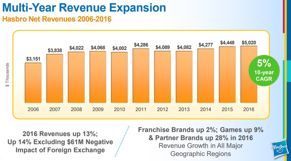 We wrote about Hasbro’s fourth-quarter report, released February 7, and we did highlight that management had pointed “to slower consumer demand for both the company and its industry in November and December,” but we also said that we think “management is confident that its innovative lines that are supported by storytelling and digital initiatives have the company well-positioned for 2018 and beyond.” What we’re watching closely at Hasbro is the long-term trajectory of its ‘Entertainment and Licensing’ business line, where on a full-year basis, operating profit in the segment nearly doubled, to $96.4 million on just ~8% revenue expansion (the division posted a near-34% operating margin). This segment may hold the keys to Hasbro’s future, but even so, Hasbro was able to still drive revenues nearly $1 billion higher during the past 5 years. Physical toy sales are under pressure, but by no means, dead.