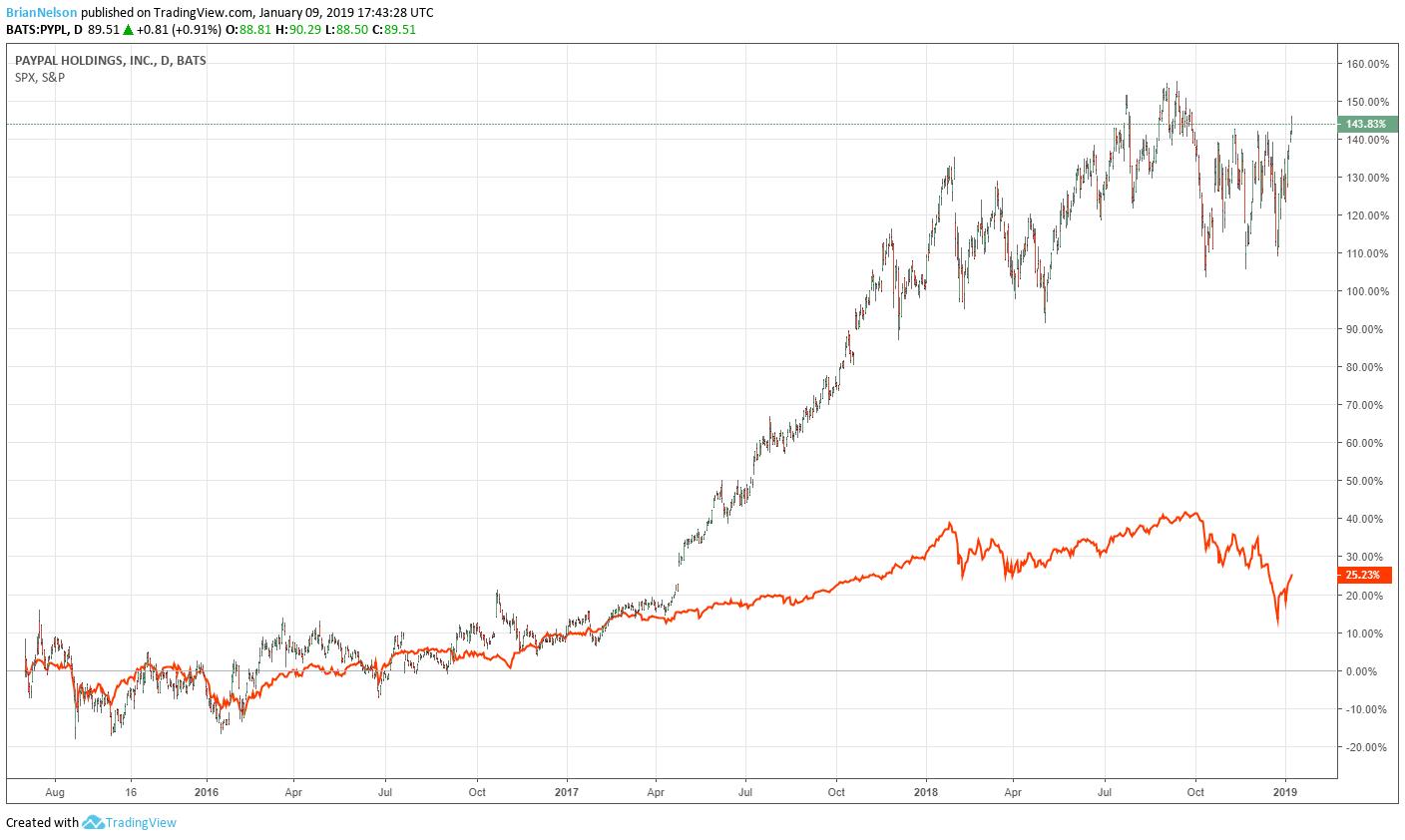 PayPal (PYPL) split from eBay (EBAY) in July 2015, and we couldn’t be more pleased with its performance since then. The company has exceeded the market’s return by more than 100 percentage points. This is simply incredible, and we hope that you are pleased. We’re also liking how a lot of our ideas are acting with respect to relative strength in this volatile market. Look–PayPal is almost making new all-time highs!