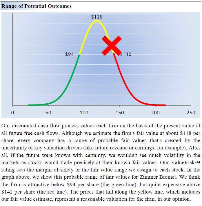 Image Shown: Shares of ZBH are trading near the top end of our fair value estimate range as of this writing, as indicated by the red ‘X’ along the yellow line.