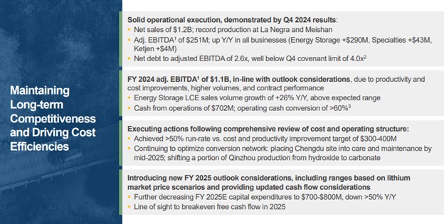 Albemarle recorded full-year cash flow from operations of $702 million, which represented 60% of adjusted EBITDA, revealing good cash flow conversion. Management plans to further reduce 2025 capital expenditures by $100 million, to the range of $700-$800 million, down more than 50% on a year-over-year basis. Albemarle noted that it has a “line of sight to breakeven free cash flow in 2025,” which should alleviate some pressure on its stock.