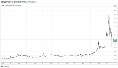 Image Shown: Shares of GameStop have been on an irrationally wild ride recently driven by what looks to have been an orchestrated and highly unethical (and perhaps illegal) short squeeze on the stock. According to some reports, during the pre-market session January 25, GameStop’s shares were up ~80%, and turned red during the trading session, with no fundamental news.