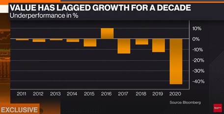 Image Shown: The book Value Trap warned about the impending collapse of the value factor, and during 2020, the value factor registered its worst performance in history. We continue to believe large cap growth is underpriced. Image Source: Bloomberg.