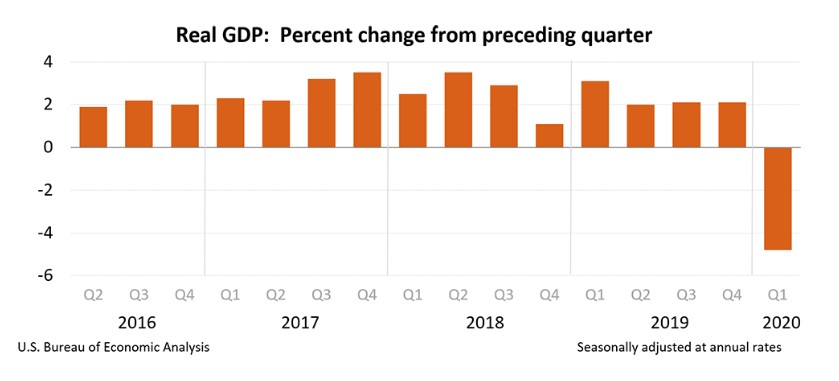 Image Source: BEA. Real GDP fell at an annual pace of 4.8% in the first quarter of 2020, according to the “advance” estimate released by the Bureau of Economic Analysis.