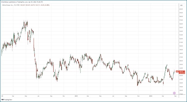 Looking ahead to full-year 2024, management is targeted diluted earnings per share in the range of $5.05-$5.17, which implies a growth rate of 2%-4.5% from the $4.95 mark it achieved in 2023. The executive team expects bottom-line growth to be weighted toward the back half of the year. In March, the company sold a part of its ownership position in Anheuser-Busch Inbev (BUD), of which it still retains an 8.1% stake. Management continues to buy back stock at an accelerated pace, as it pays a lofty dividend yield. Though Altria won’t win any awards for ESG, the company’s ~9.1% dividend yield is too hard to pass up, in our view.
