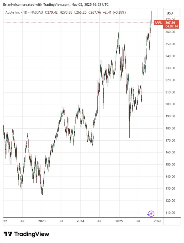 For the 12 months ended September 27, Apple generated $111.5 billion in cash from operations, while it spent $12.7 billion in property, plant, and equipment, resulting in free cash flow of $98.8 billion. Looking to the December quarter, total company revenue is expected to grow 10%-12% year-over-year, resulting in its best quarter ever. Apple expects iPhone revenue to grow double-digits year-over-year, which would be its best iPhone quarter ever. Services revenue is targeted to grow at a similar year-over-year pace to what it reported in 2025. Gross margin is expected between 47%-48%, which includes an estimated impact of $1.4 billion of tariff-related costs. We continue to like Apple as an idea in the newsletter portfolios.