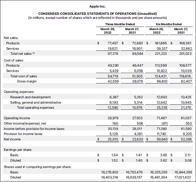 Apple reported record quarterly revenue from its ‘Services’ segment last fiscal quarter (includes its digital services, AppleCare services, payment services, and advertising revenues)which hit $19.8 billion, while its ‘Products’ segment (includes sales of its hardware offerings) posted record revenue for the quarter ended in March 2022 of $77.5 billion (keeping in mind Apple’s quarter that ends in December benefits from the holiday shopping season). Its GAAP revenues grew 9% year-over-year last fiscal quarter with its Services revenues up 17% and its Products revenues up 7%.