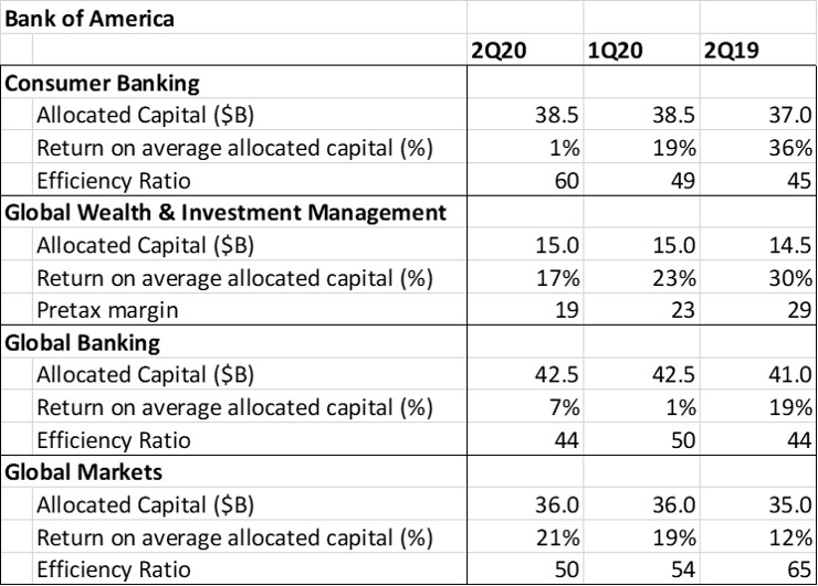 Image Shown: Bank of America’s segment metrics. Image Source Analyst collection of figures from Bank of America’s 2Q2020 Earnings Presentation.