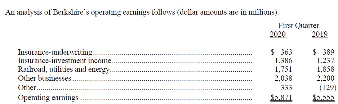 Image Shown: While Berkshire Hathaway’s operating earnings rose year-over-year in the first quarter of 2020, we caution that exogenous headwinds will likely depress its financial performance going forward as the firm waits out the pandemic. Image Source: Berkshire Hathaway – First Quarter of 2020 Earnings Press Release