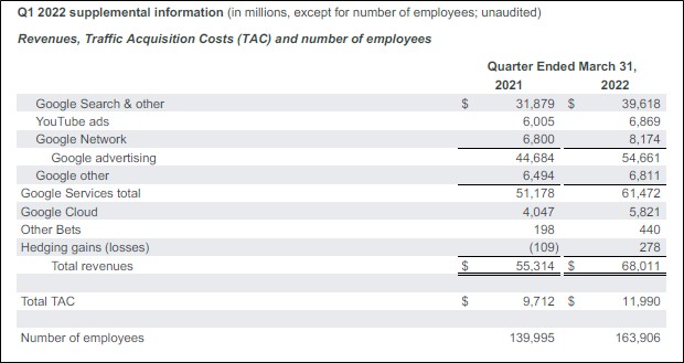 “Turning to Google Cloud. Cloud’s performance in the first quarter reflects growing deal volume and strength across multiple industries and regions. Customers are increasingly choosing Google Cloud to help them digitally transform their businesses using our global infrastructure offerings, our data analytics and AI capabilities and the collaboration benefits of Workspace. We continue to invest aggressively in Cloud given the sizable market opportunity we see.” — Ruth Porat, CFO of Alphabet
