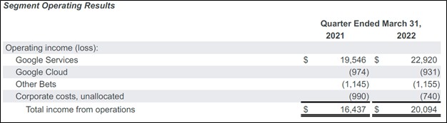 Image Shown: Alphabet’s core business is much profitable than it first appears as the firm is utilizing those profits to fund investments in its longer term growth drivers, particularly at its Google Cloud and various Other Bets operations. Image Source: Alphabet – First Quarter of 2022 Earnings Press Release