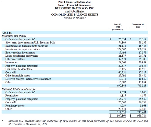 Image Shown: We are intrigued by the potential acquisition opportunities Berkshire Hathaway may pursue in the current environment, given its large cash-like position on hand at the end of June 2022. Image Source: Berkshire Hathaway – 10-Q SEC filing covering the Second Quarter of 2022