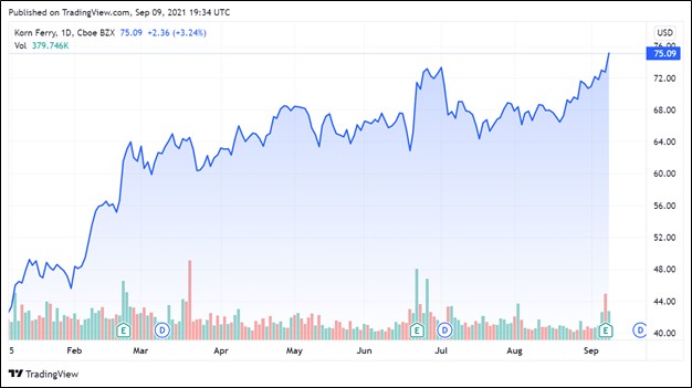 Image Shown: Shares of Korn Ferry have surged higher year-to-date, and we see room for additional capital appreciation upside. We added shares of Korn Ferry as an idea to our Best Ideas Newsletter portfolio back in January 2021 and continue to be huge fans of the name. The top end of our fair value estimate range sits at $104 per share of Korn Ferry.