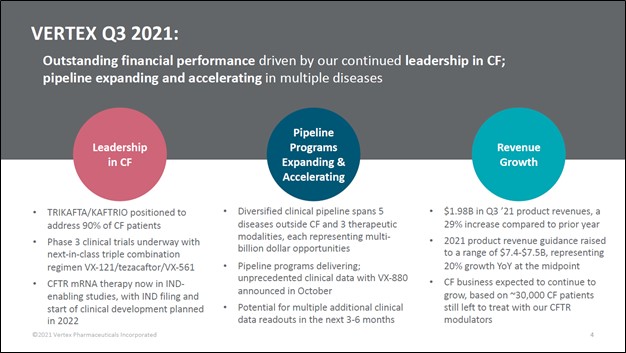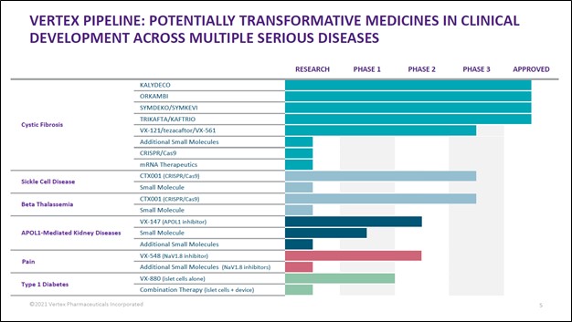 Image Shown: In our view, Vertex Pharma has a robust drug pipeline complemented by its existing commercialized CF drug portfolio. Image Source: Vertex Pharma – Third Quarter of 2021 IR Earnings Presentation