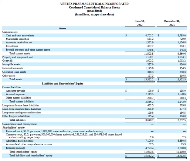 Image Shown: Vertex Pharma had a nice net cash position on hand at the end of June 2022, putting the firm in a prime position to ride out near term exogenous shocks. Image Source: Vertex Pharma – 10-Q SEC filing covering the Second Quarter of 2022